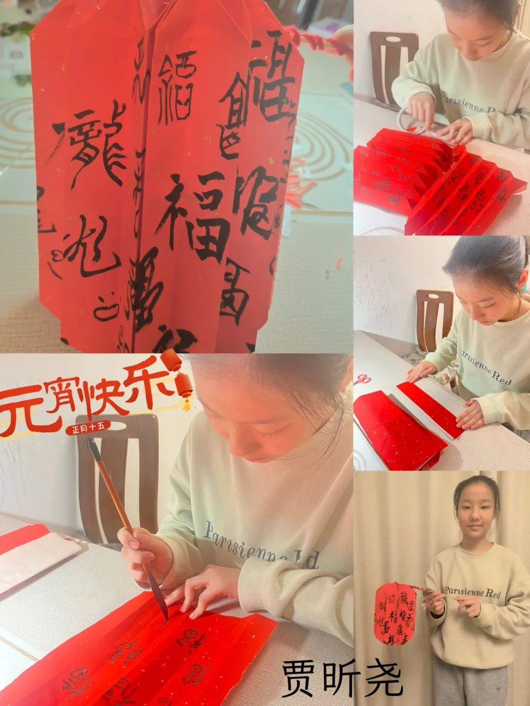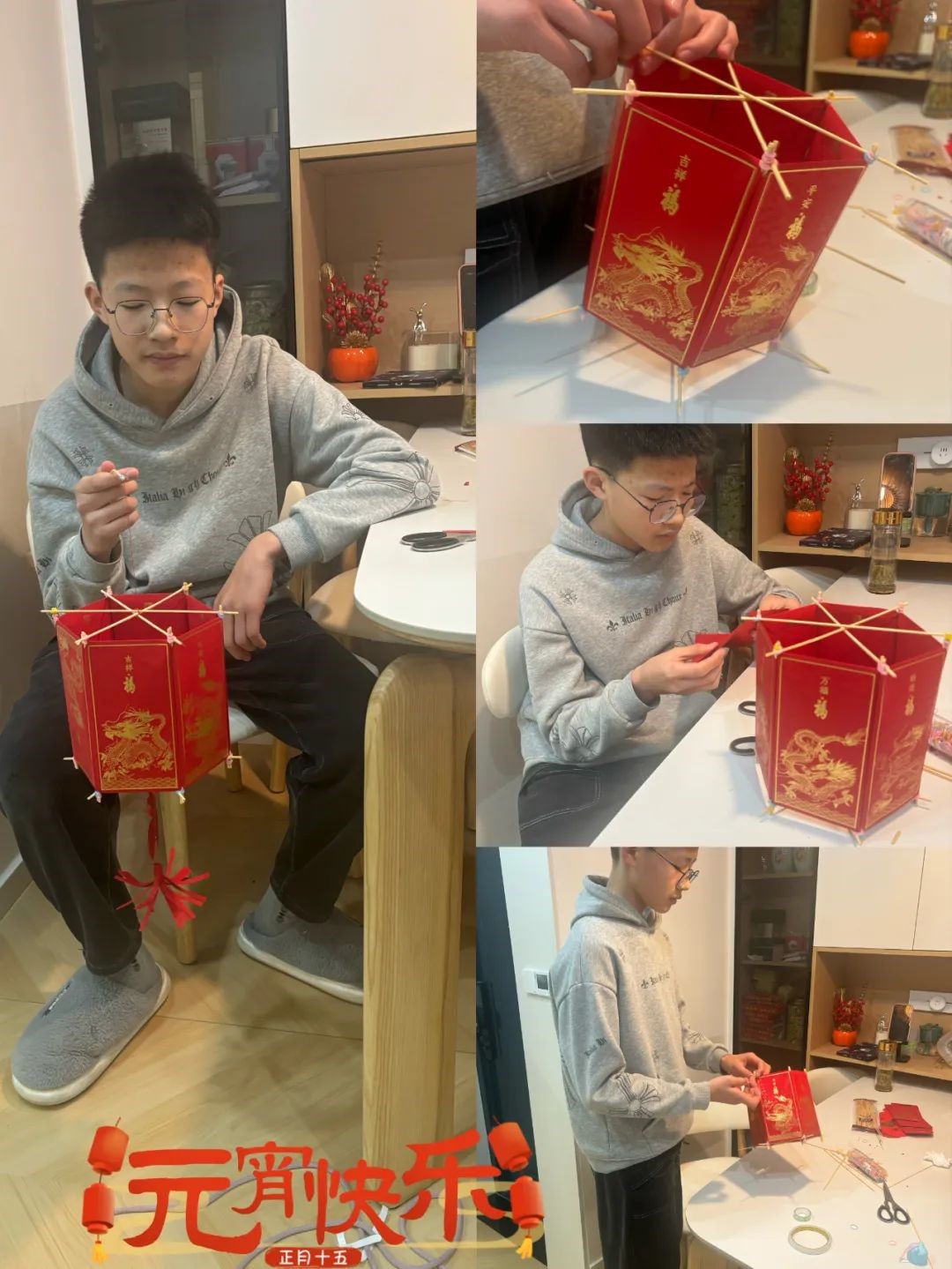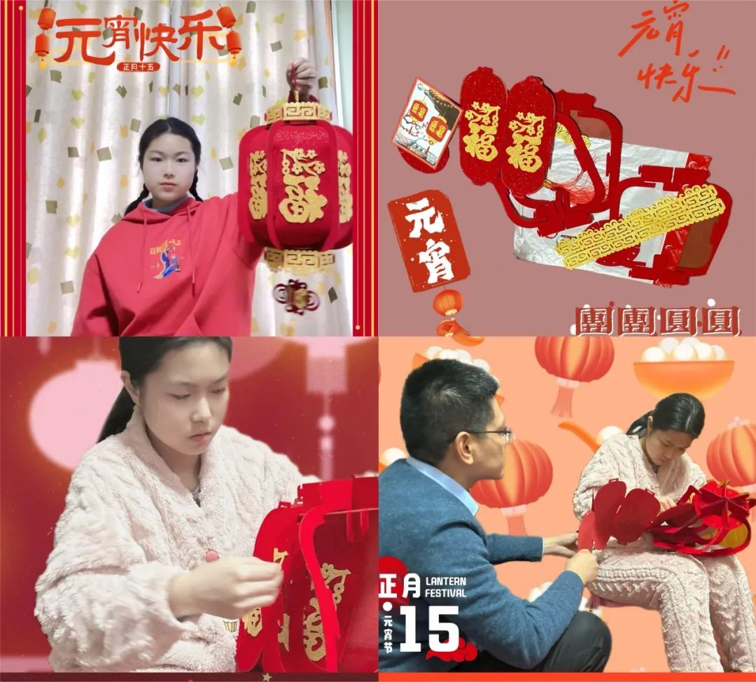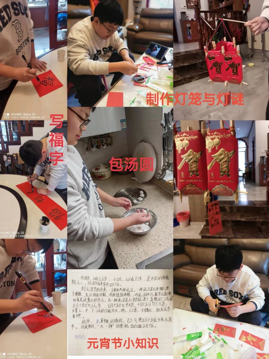 活动现场热闹非凡,孩子们先是通过网上学习或民间收集,深入了解元宵节的由来。吃元宵是最重要的节日习俗,寄托着对全家团团圆圆的祝愿。孩子们在家长的指导下学习包汤圆,享受亲手制作元宵的乐趣。品尝着亲手制作的汤圆,家长和孩子们脸上都洋溢着幸福的笑容。元宵佳节自然也少不了制作灯笼, 孩子们一步步进行搭建、固定、组装、粘贴,造型多样的花灯逐渐呈现出来。同时还有猜灯谜、写福字等丰富多彩的活动。