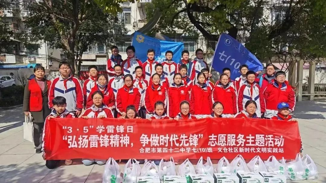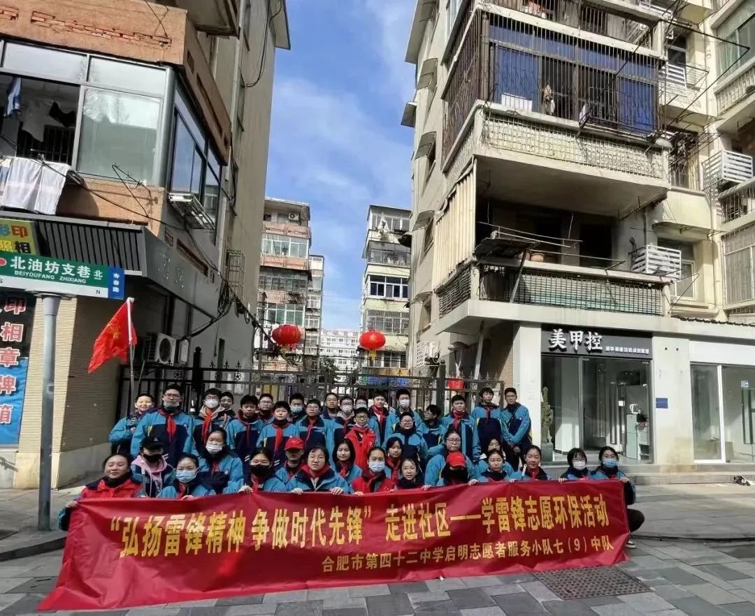 近年来,学校利用寒暑假,积极开展“启明志愿者服务”系列活动。街道社区、敬老院、高铁和地铁车站、图书馆、公园,合肥市第四十二中的小志愿者们的身影遍布合肥各个地方,用实际行动践行着雷锋精神、志愿者服务精神。三月,合肥市第四十二中学少先大队走进长江路天桥开展志愿服务活动,七(9)中队志愿者走进逍遥津街道开展学雷锋主题志愿环保活动, 七(10)中队志愿者前往义仓小区开展关爱老人活动、七(11)中队志愿者参观雷锋同志事迹展览馆、八(4)班团支部志愿者走进大东门地铁站开展志愿服务活动。