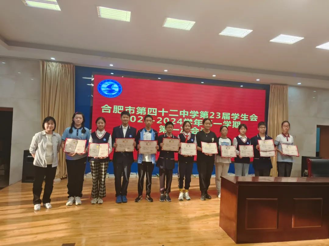 会议第一项,由合肥四十二中少先大队辅导员李孝环宣读第22届学生会优秀学生干部获奖名单。大会第二项德育处相关领导为第22届学生会成员颁发奖状。