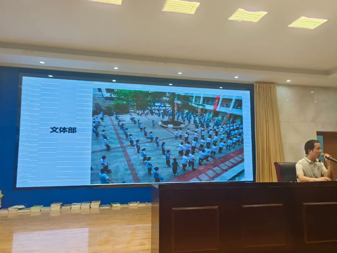 会议第六项,由少先大队辅导员李孝环发言。他通过PPT对过去一年的学生会部门工作做了总结和点评,细化各自部门的职责,并对新一届学生会工作进行了布置和展望。