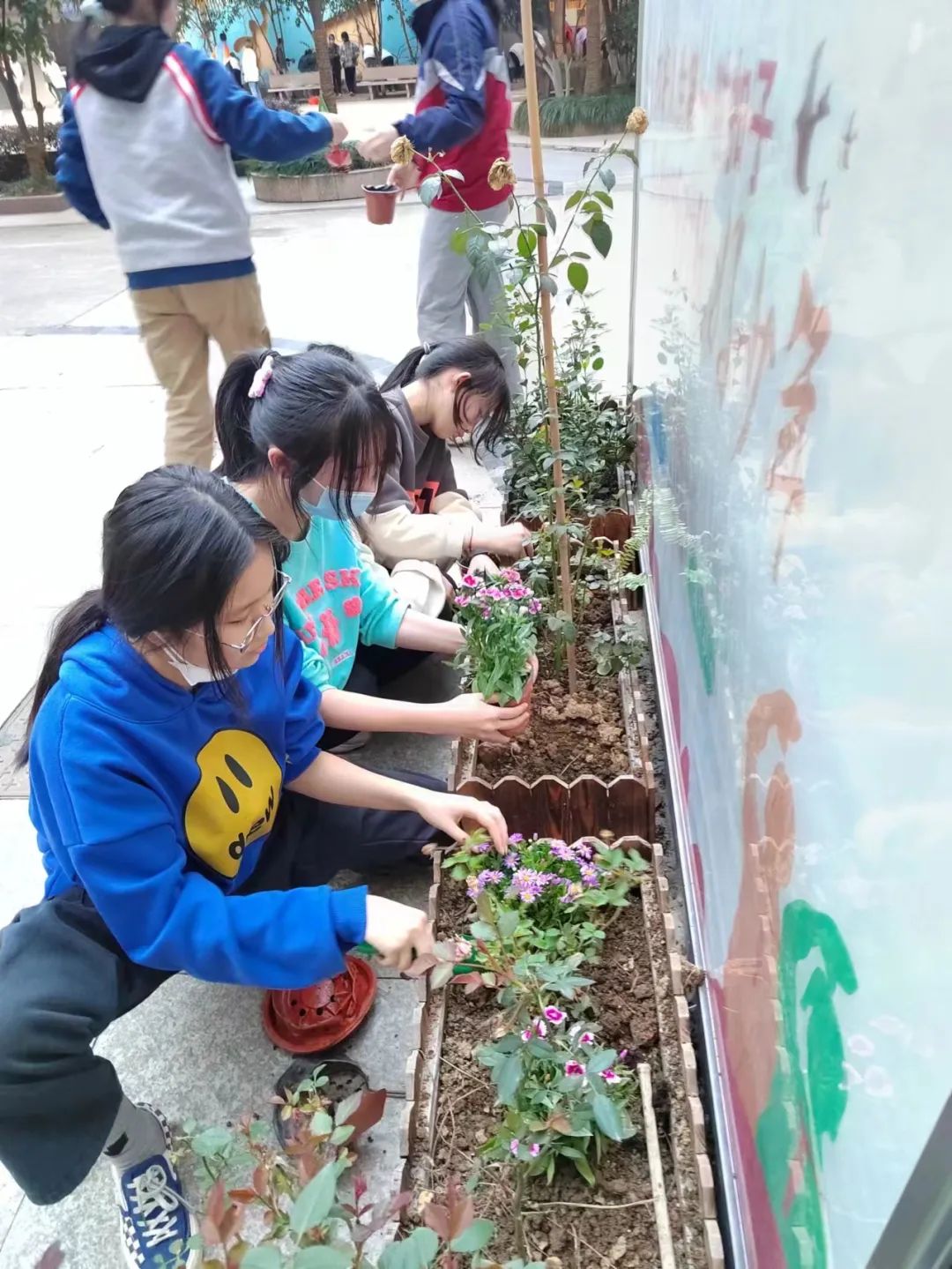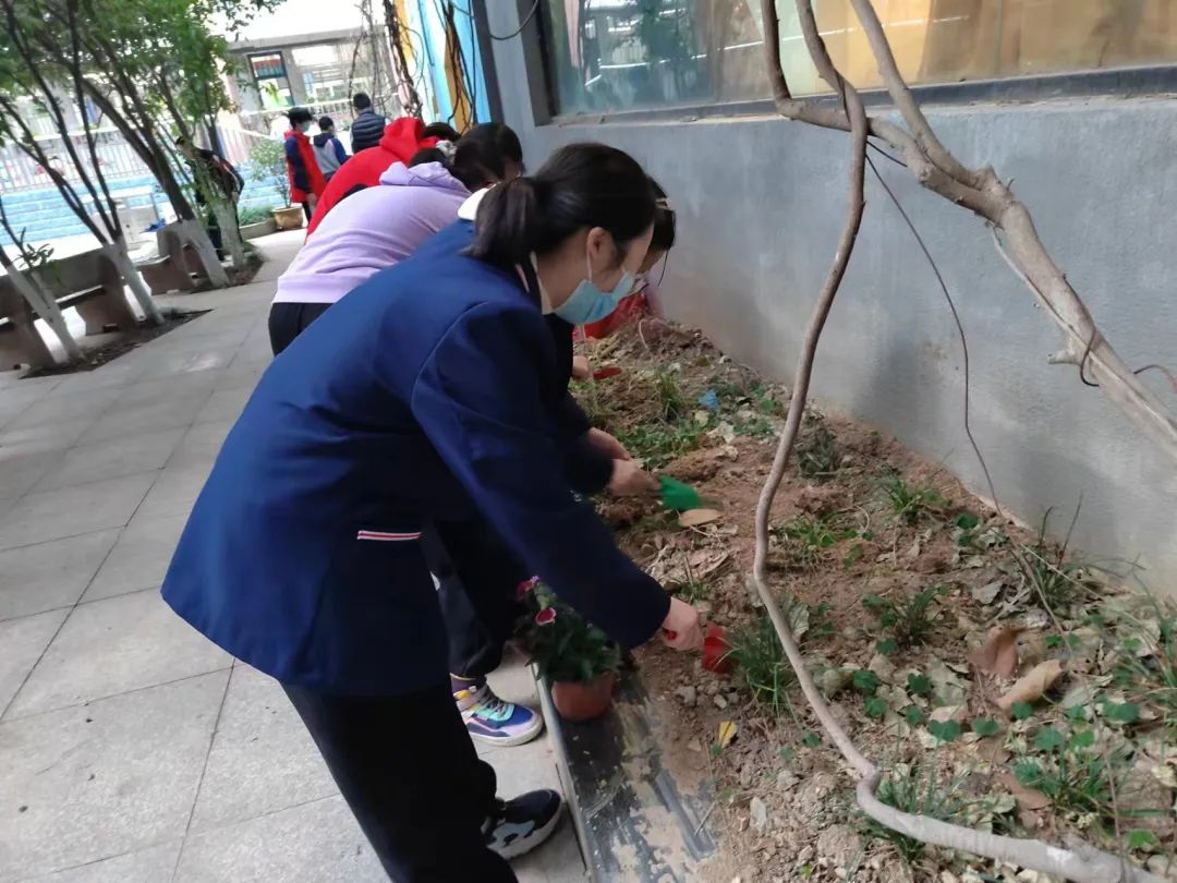 春和景明,暖风吹送,2023年3月7日下午最后一节社团课,合肥市第四十二中学“萌生物语”社团全体同学在罗老师的带领下,在校园内开展植花活动,积极响应合肥市第四十二中学三月份“学雷锋”主题月的号召。