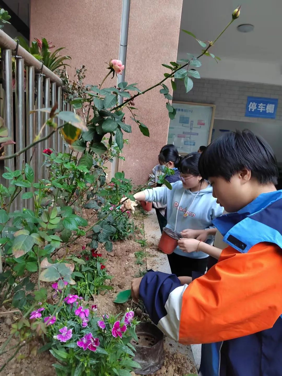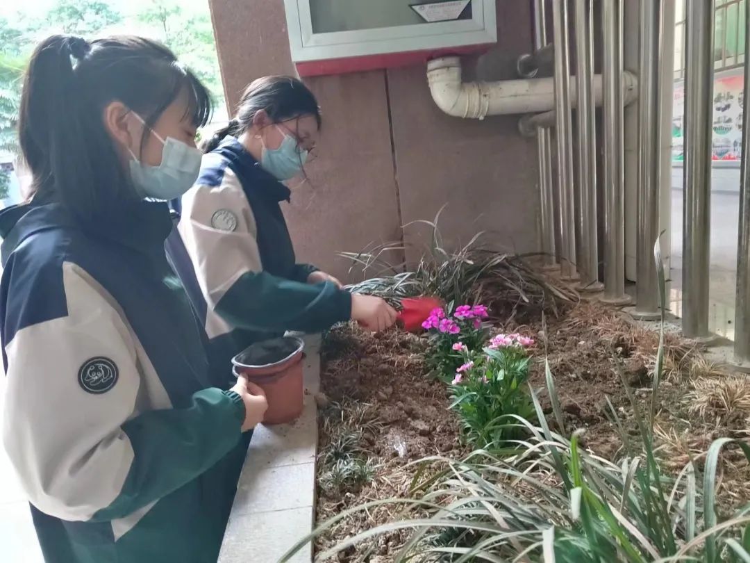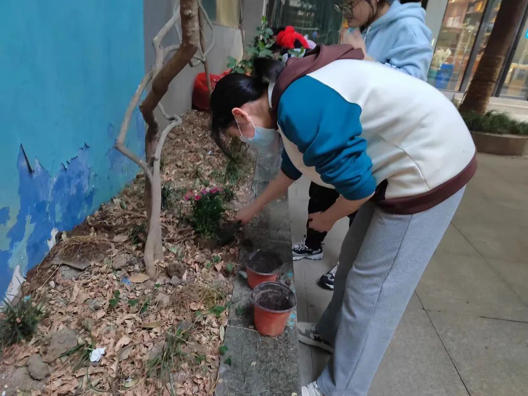 社团课开始后,同学们跟着老师来到一楼广场集合。两两一组,分发工具和花苗,以分工合作的形式开展植花活动。准备完毕后,同学们在罗文婧老师带领下分别在学校小花园、走廊、苗圃中种植花苗。翻土,种苗,埋土,压实,每一个同学都一丝不苟地种下一抹绿色。